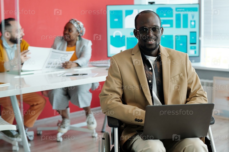 Портрет улыбающегося чернокожего человека в инвалидном кресле с ноутбуком