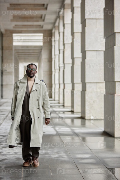 Черный мужчина, носящий пальто в городском коридоре