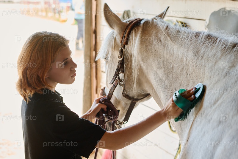 Чистить лошадь в стабильном состоянии с осторожностью и вниманием