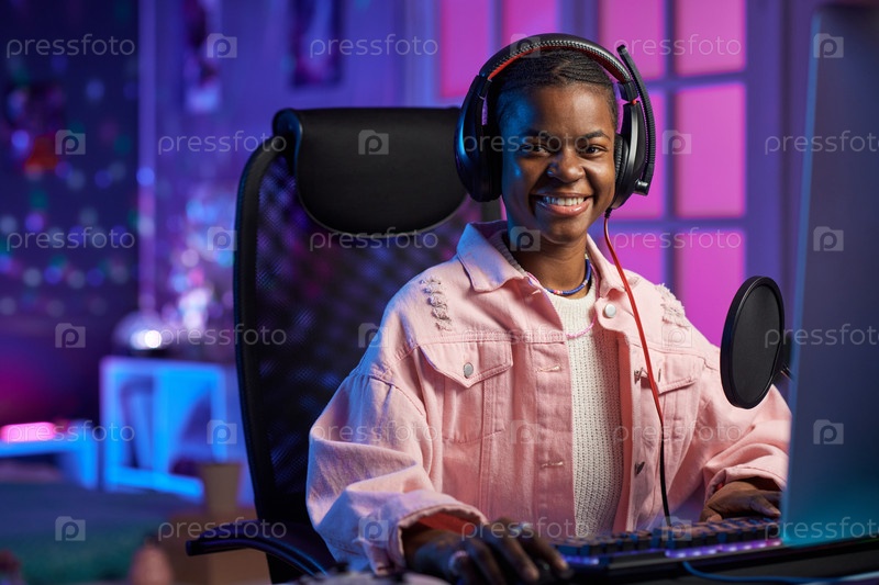 Женщина играет в видеоигры под неоновыми огнями