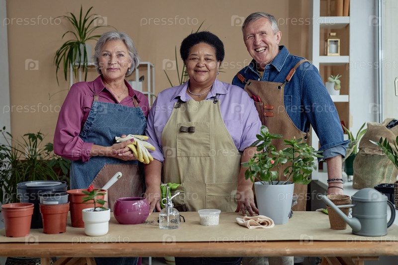 Пожилые люди, улыбающиеся на камеру, наслаждаются садоводством