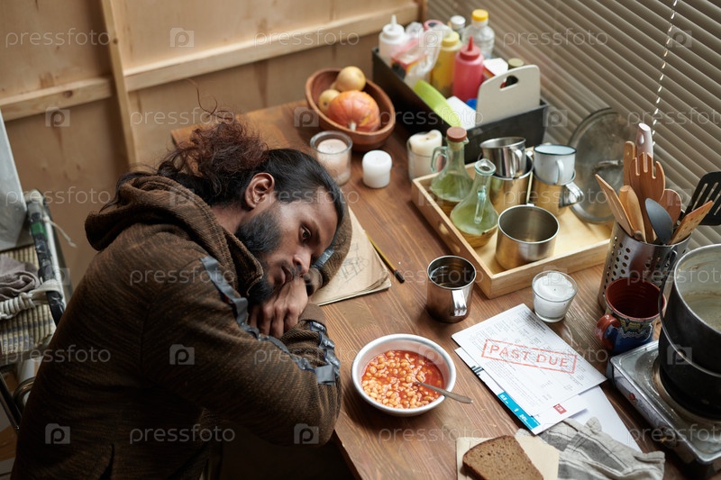 Отдыхающий мужчина, опираясь на стол рядом с едой в деревенской обстановке