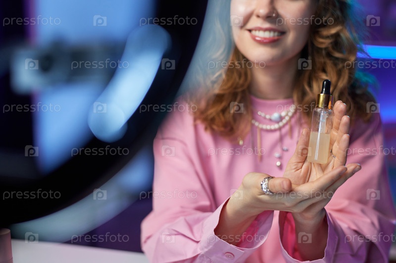 Близкий взгляд на улыбающуюся девушку, отзываясь о продуктах красоты