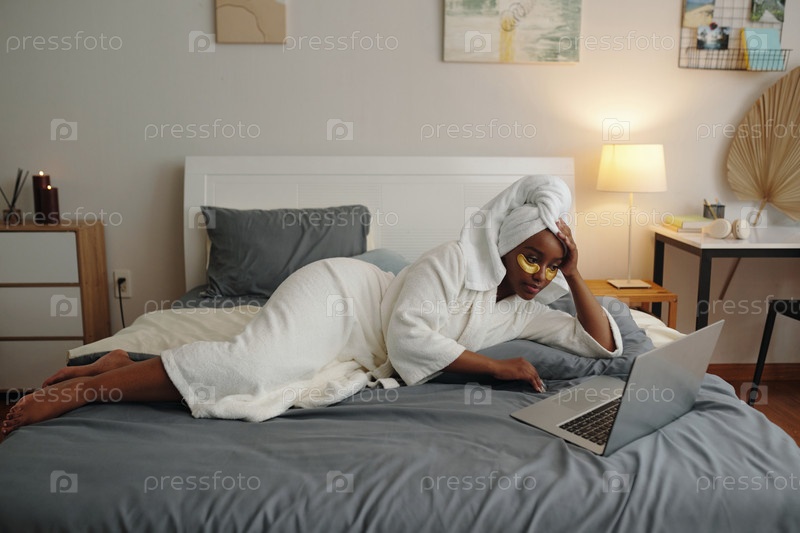 Расслабляясь в постели, используя ноутбук в удобном белом платье