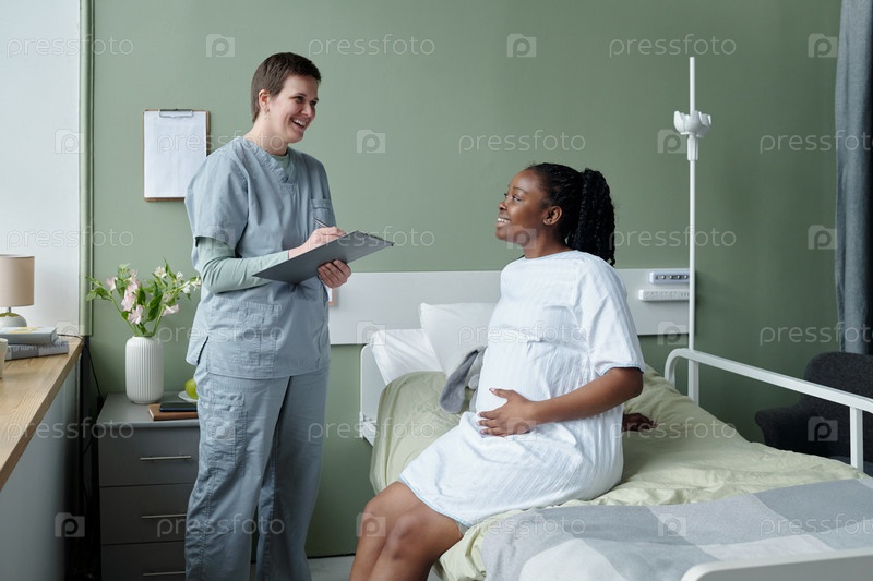 Медсестра занимается с беременной женщиной в больничной комнате