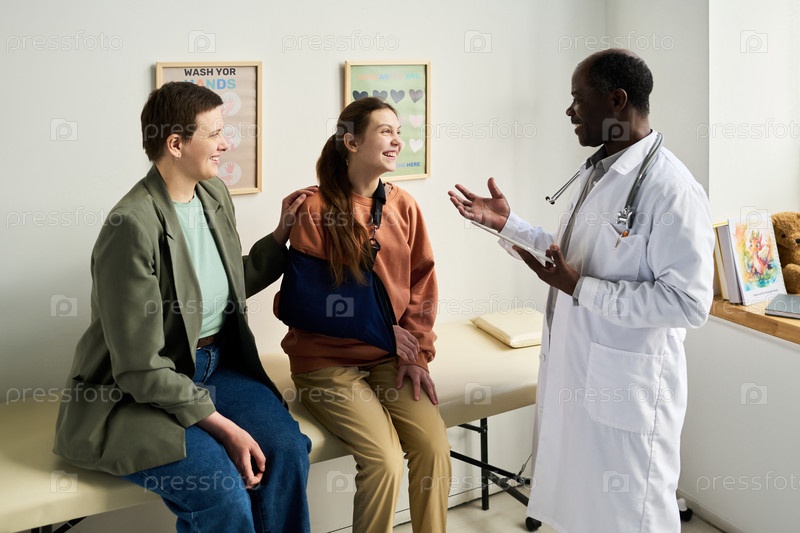 Врач обсуждает с раненым пациентом в медицинском кабинете