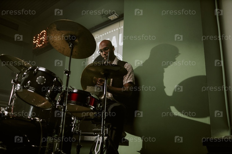 Молодой чернокожий мужчина настраивает барабанный комплект