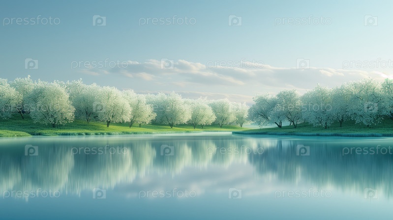 Зимние деревья отражаются в спокойной реке под голубым небом