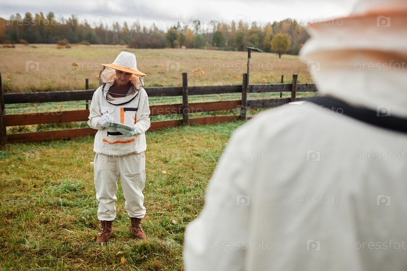 Женщина-пчеловодка пишет в блокноте против осеннего леса на Апиарной ферме