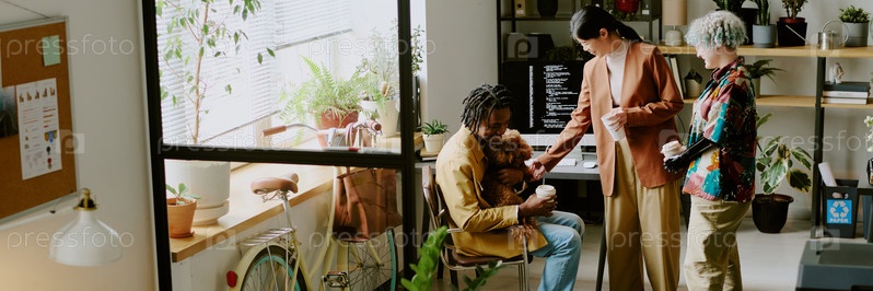 Коллега во время кофейного перерыва в биофилической офисной веб-странице Баннер