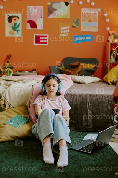 Девушка-подросток, выбирающая музыку для учебы