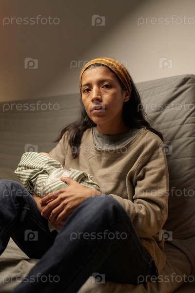 Держать новорожденного ребенка, сидя на диване и нося головный пояс