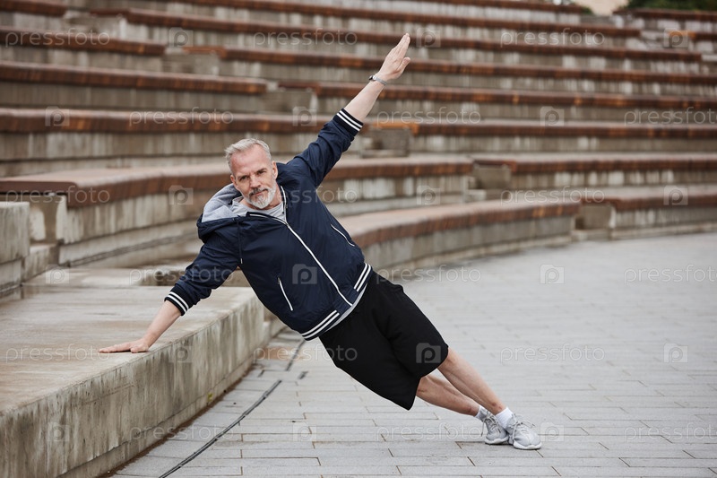 Мужчина в боковой доске тренирует основные мышцы в городском парке