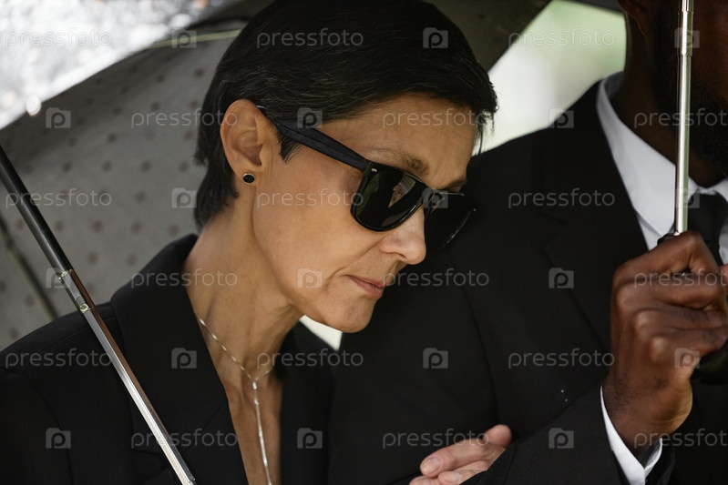 Портрет скорбящей женщины в солнцезащитных очках, цепляющейся за плечо чёрного мужчины
