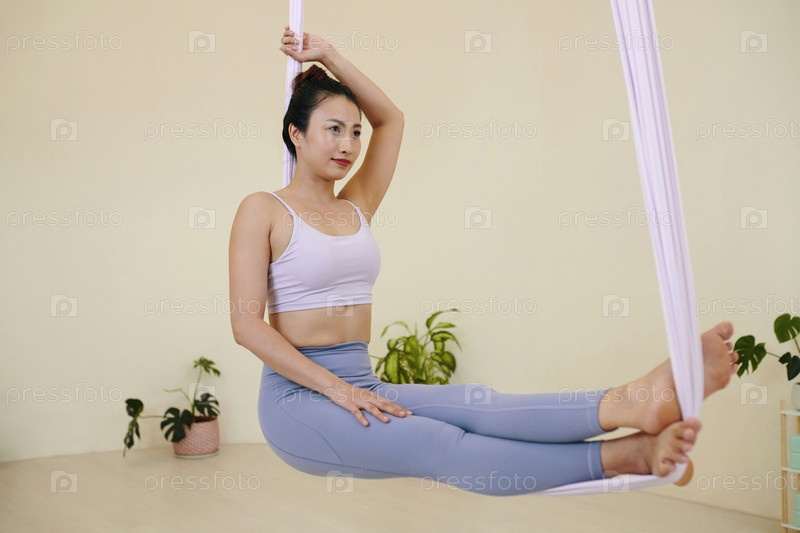 Практика воздушной йоги в гостиной с комнатными растениями