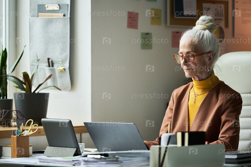 Рабочая старшая женщина, использующая ноутбук в современном офисе
