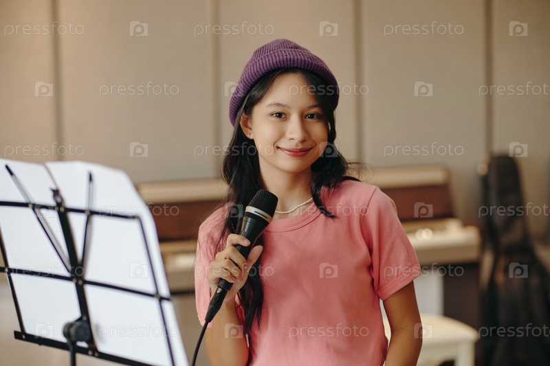 Портрет улыбающейся молодой женщины, держащей микрофон в студии