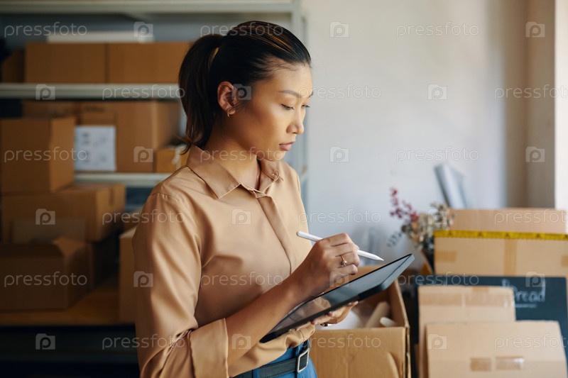 Женщина, использующая планшетный компьютер в складе