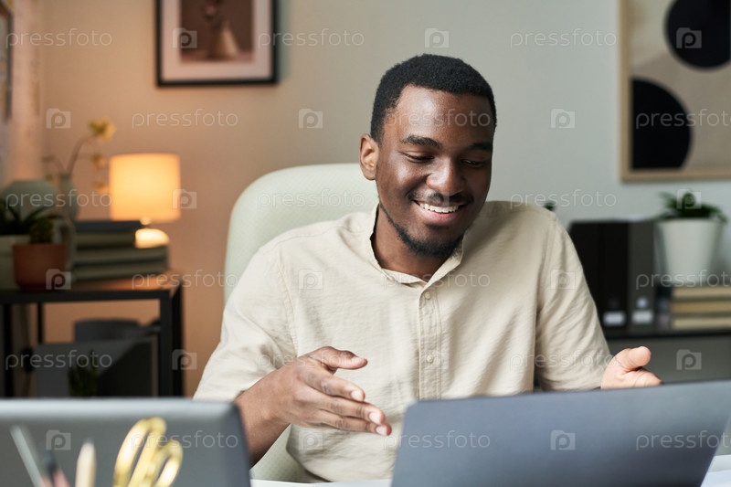 Улыбающийся чернокожий мужчина работает на ноутбуке в домашнем офисе