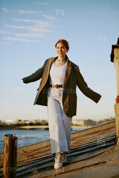 Улыбающаяся молодая женщина наслаждается живописным видом на устье