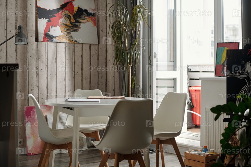 Пустой обеденный стол рядом с небольшим балконом с деревянной стеной