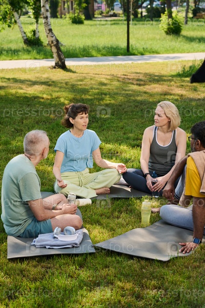 Группа зрелых спокойных людей на лужайке