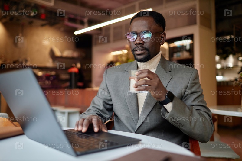 Рабочий мужчина с ноутбуком и пьет кофе в кафе