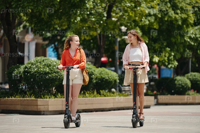 Наслаждаясь поездкой на электрических скутерах в солнечный день в парке