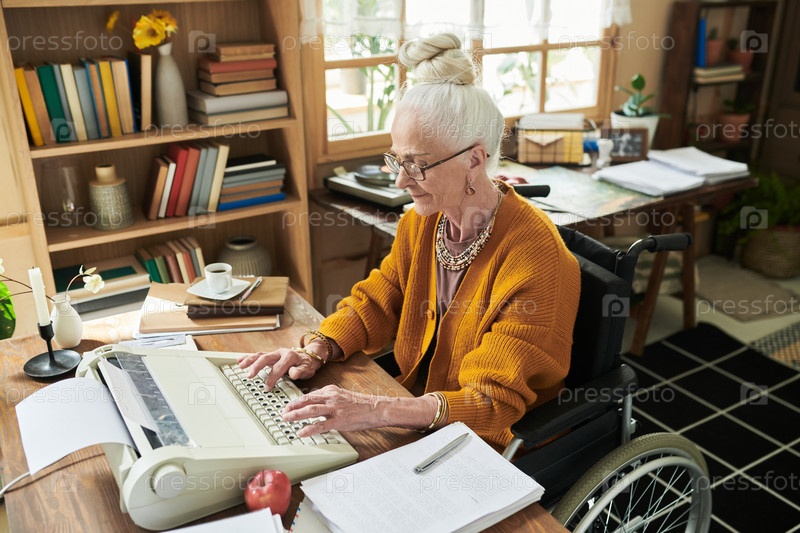 Пожилая женщина использует пишущую машину в хорошо освещенном офисе