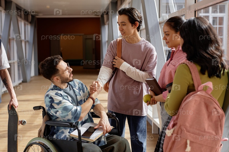 Студент с помощью инвалидной коляски приветствует одноклассника рукопожатием