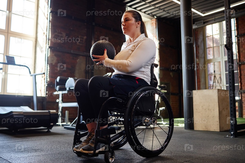 Женщина на инвалидном кресле занимается силовыми тренировками