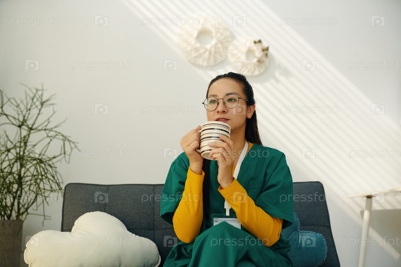 Медсестра отдыхает на диване и держит чашку с кофе