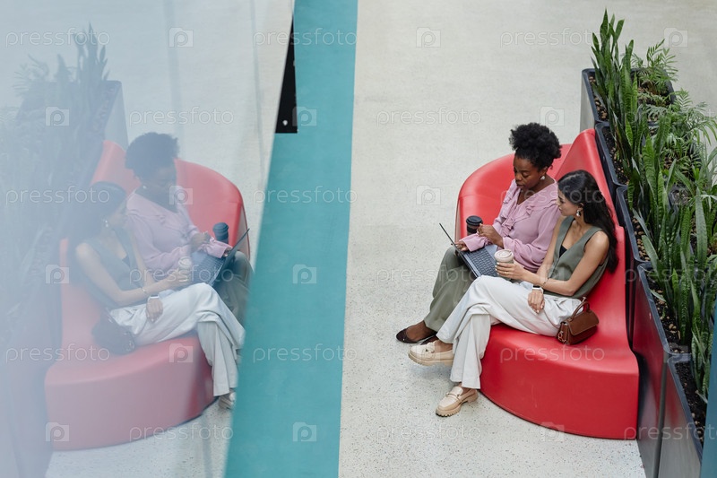 Две женщины смотрят на экран ноутбука, сидящие на диване в гостиной офисного центра