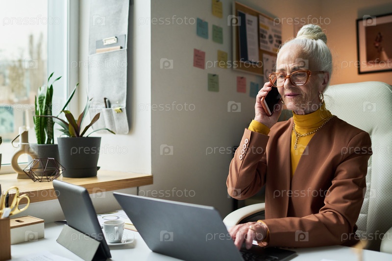 Пожилая женщина использует ноутбук и разговаривает по телефону