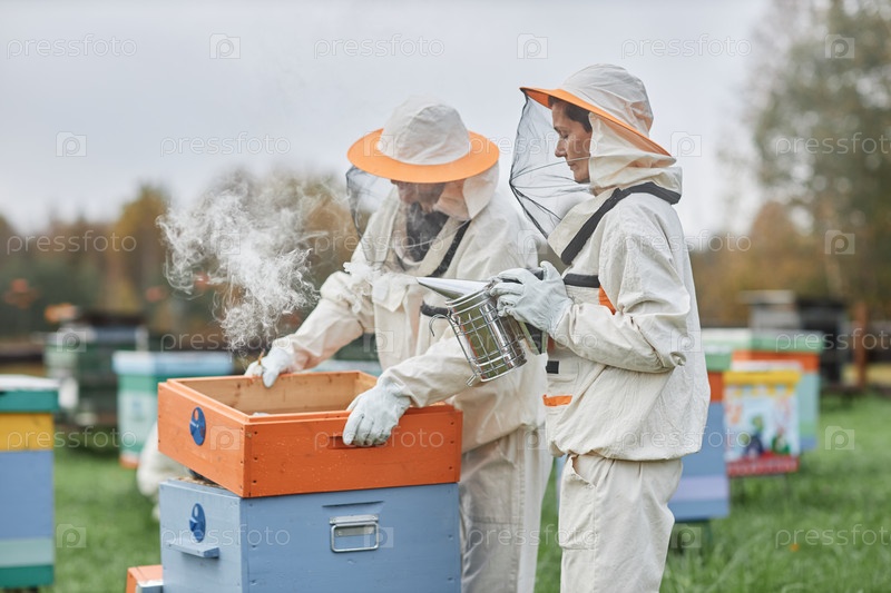 Пчеловод, использующий пчелиный курильщик во время сбора меда на Апиарной ферме