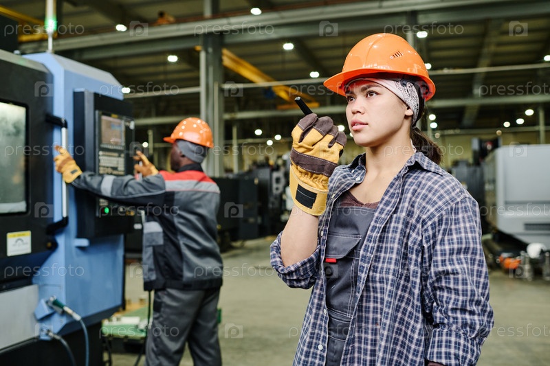 Женщина, носящая жесткую шляпу Работающая в промышленной среде