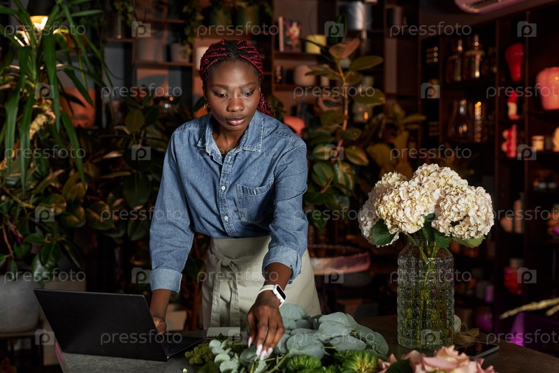 Женщина-цветочник использует компьютер на стойке