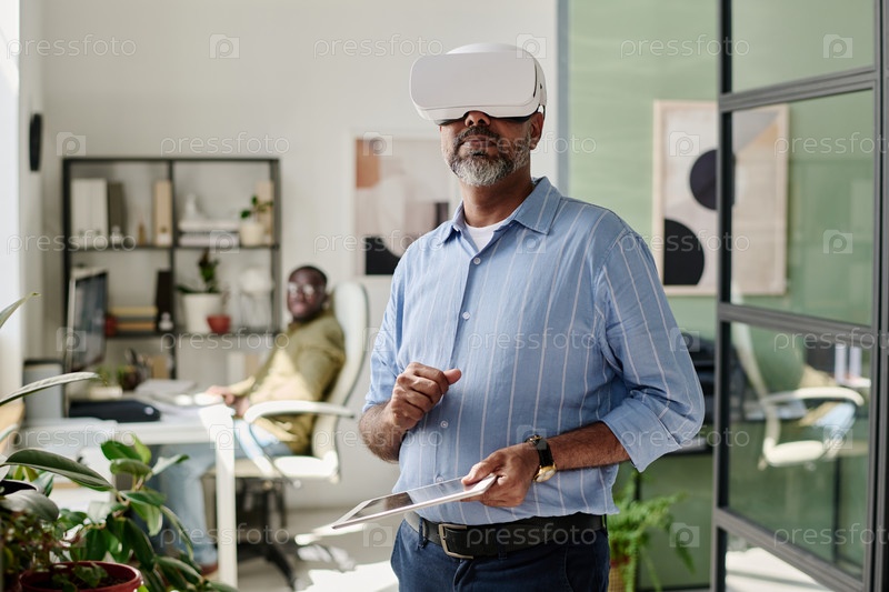 Человек, носящий гарнитуру виртуальной реальности в современном офисе
