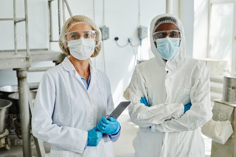 Портрет женщины-технолога процесса, позирующей с коллегой-мужчиной на фармацевтическом заводе