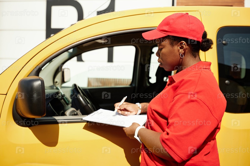 Проверка документов на доставку рядом с желтым транспортным средством