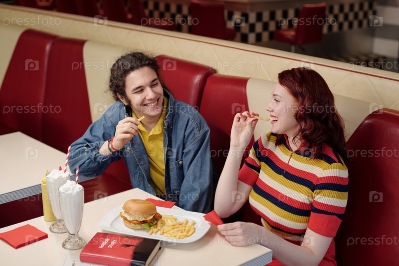 Улыбающиеся друзья едят закуски в Retro Diner Booth