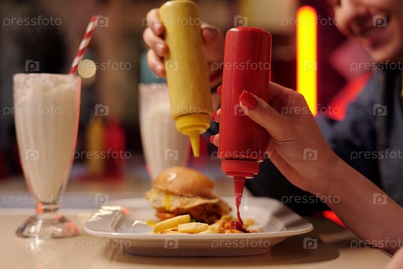 Добавление кетчупа и горчицы к картофелю фри с бургером