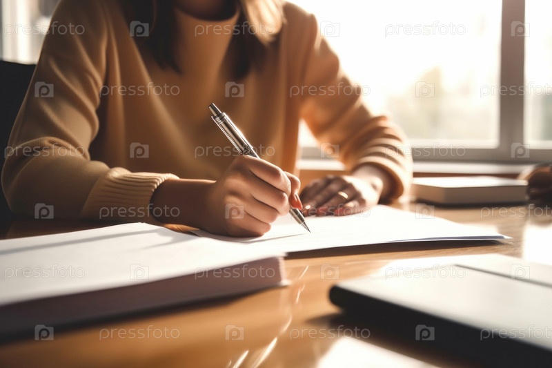 Женщина занимается бумажной работой за столом AI