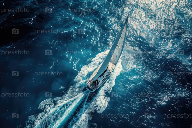 Вид с воздуха парусного катера, плавающего по голубым водам
