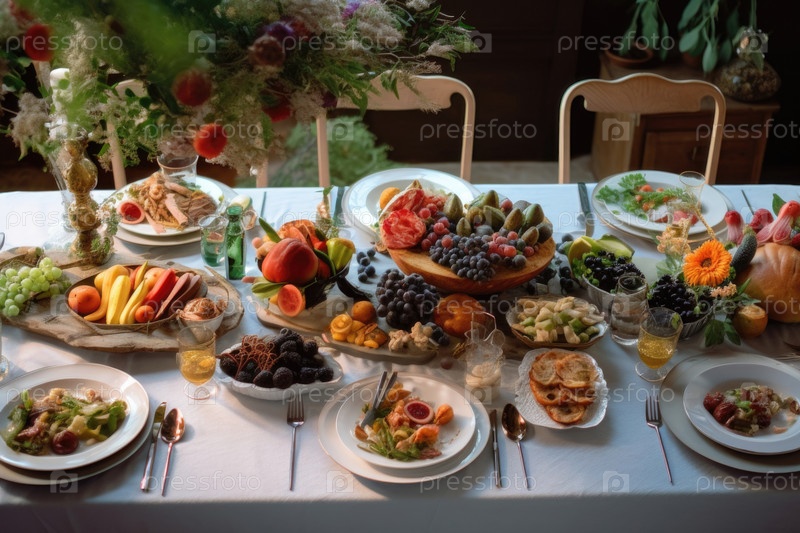 Обеденный стол с едой и фруктами AI