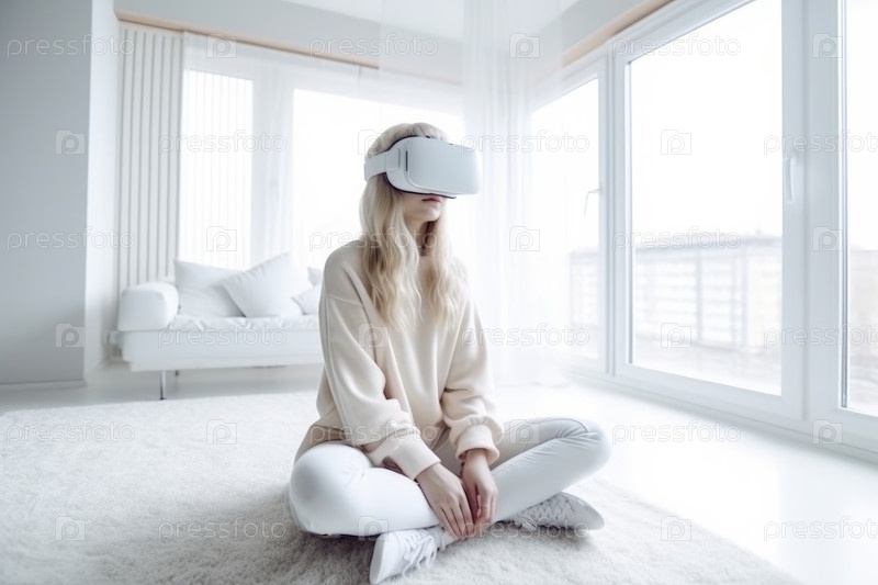 Женщина в очках VR сидит в комнате AI