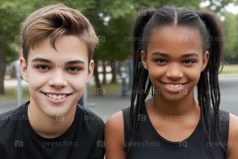 Мультиэтнический подросток мальчик и девочка улыбаются на открытом воздухе