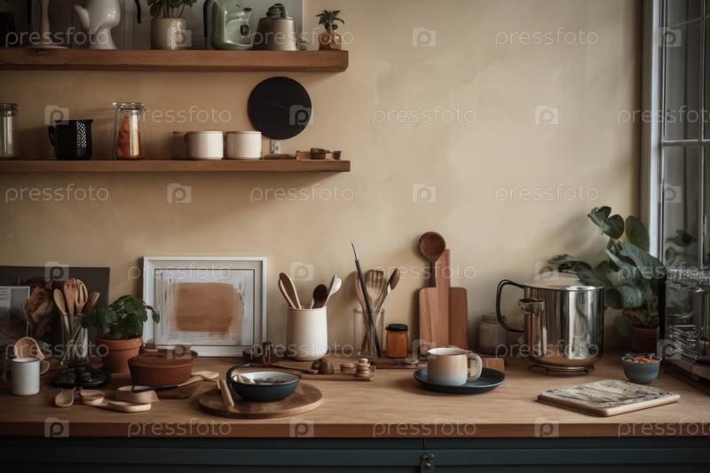 Деревянный кухонный стол с посудой AI