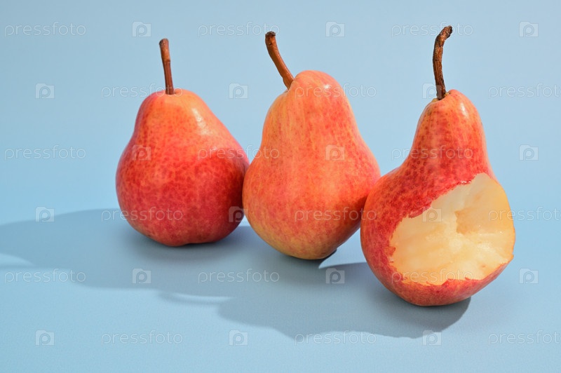 Три желто-красные груши стоят рядом с черенками вверх. Одна груша откушена. Фрукты отбрасывают резкую тень