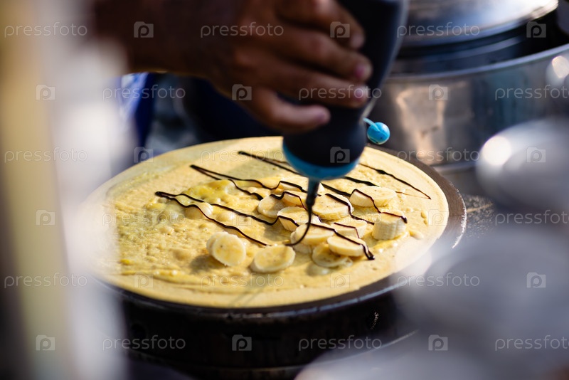 Процесс приготовления уличной еды, блинов с бананами и шоколадом